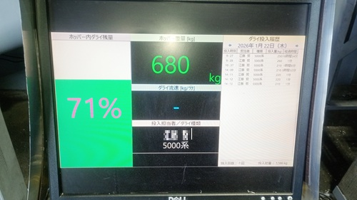 ホッパー残量と現在の重量値、担当者、材料種類、投入履歴、特に投入履歴は前回投入からの時間を表示させており、作業者同士で競ってもらう仕掛けをしています(笑)