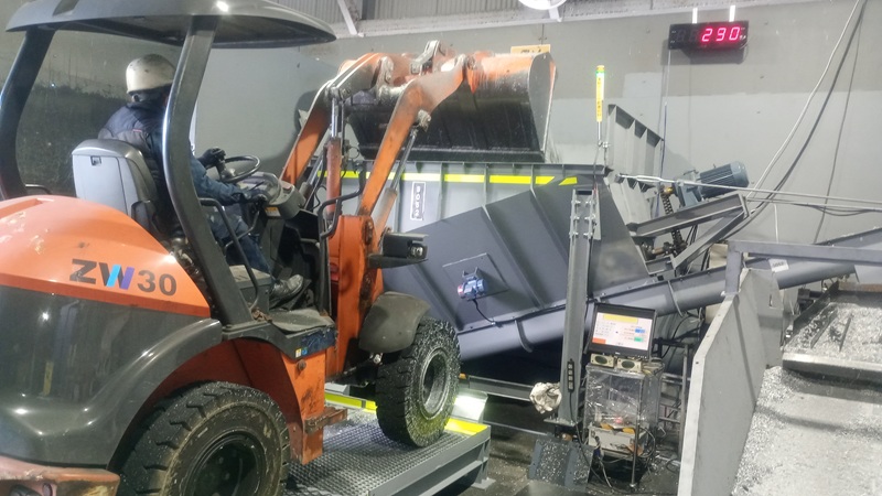 ホッパーへの材料投入はホイールローダーを使用します。