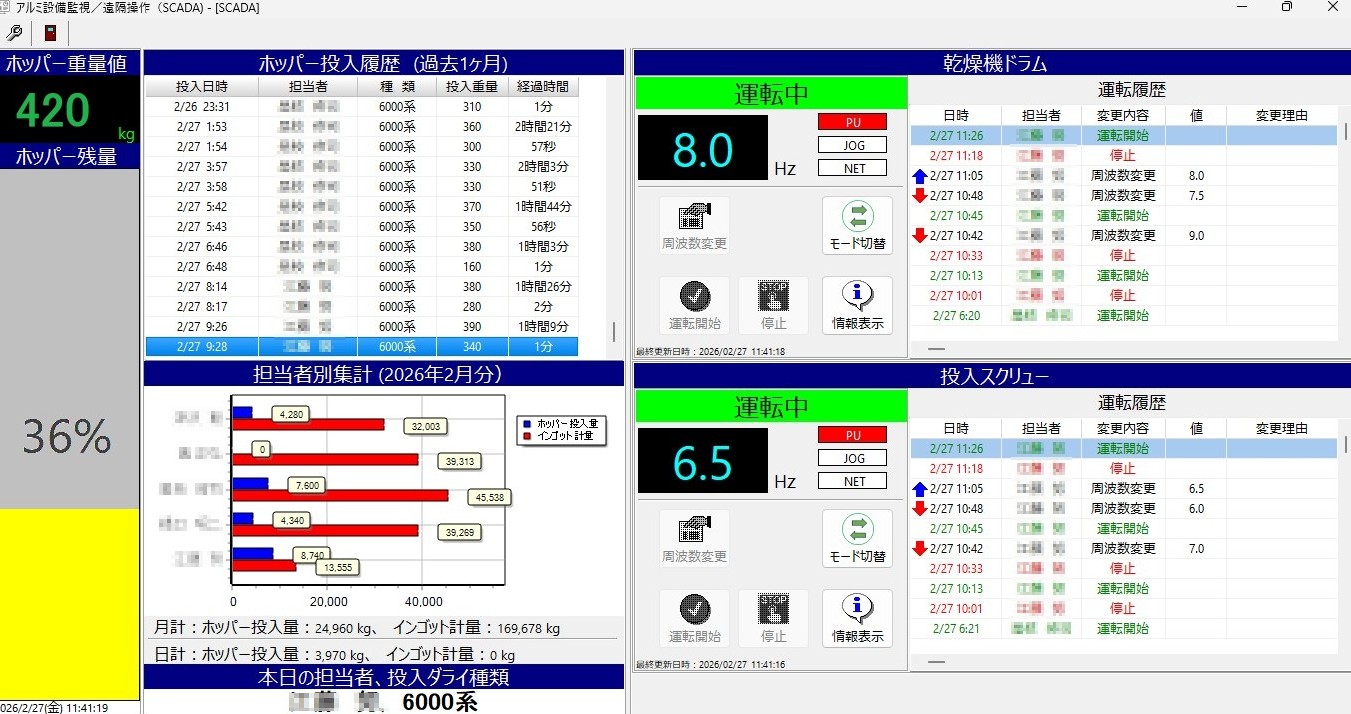 アルミ熔解設備の状態を集中表示、コントロールできるようにしてみました。